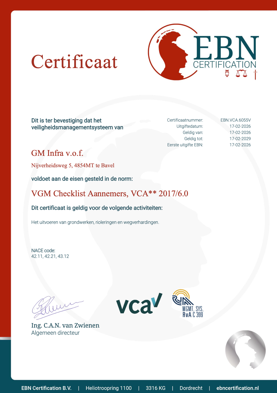 Bij GM Infra geloven we in continue verbetering en professionele groei. Daarom zijn we lid van Bouwend Nederland en bezitten we volgende certificaten certificeringen:
